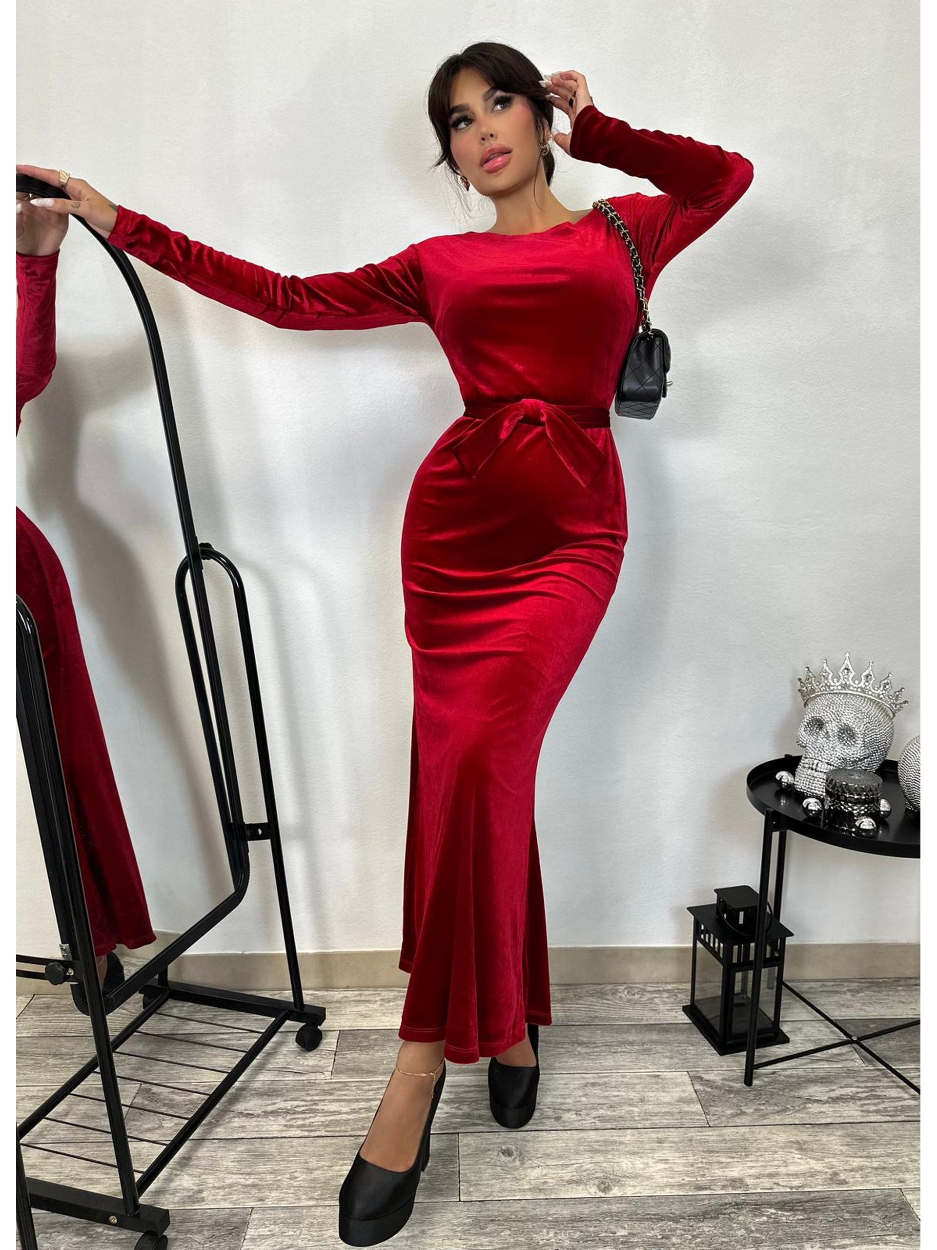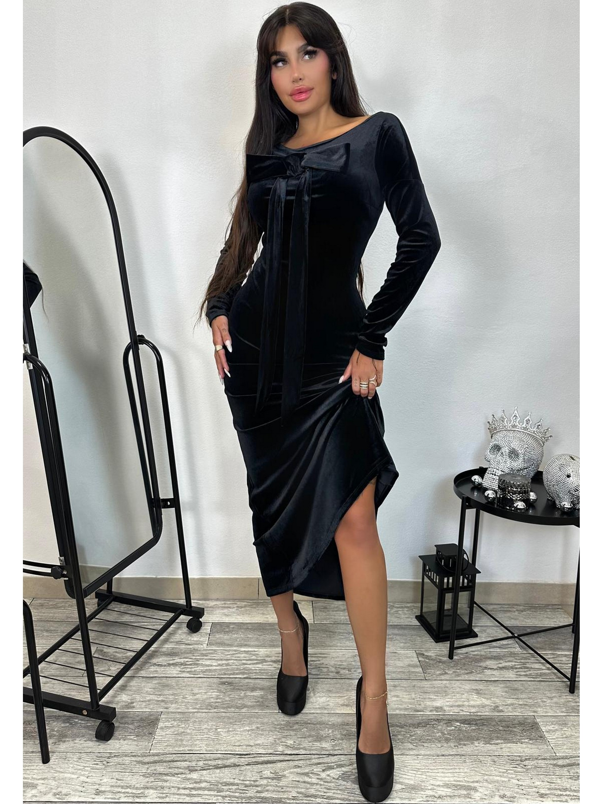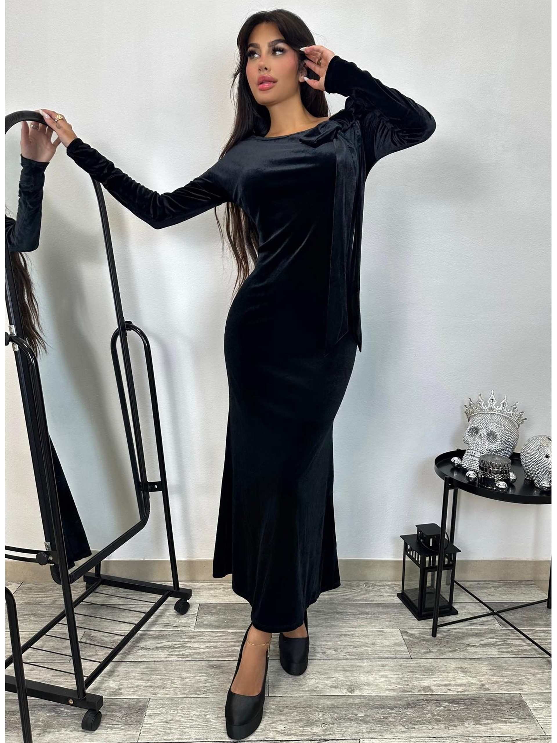 Długa sukienka z welury z dopinaną kokardą, którą możemy przypiąć w dowolnie wybranym przez nas miejscu. Prosty fason, dekolt w łódkę, długi rękaw.