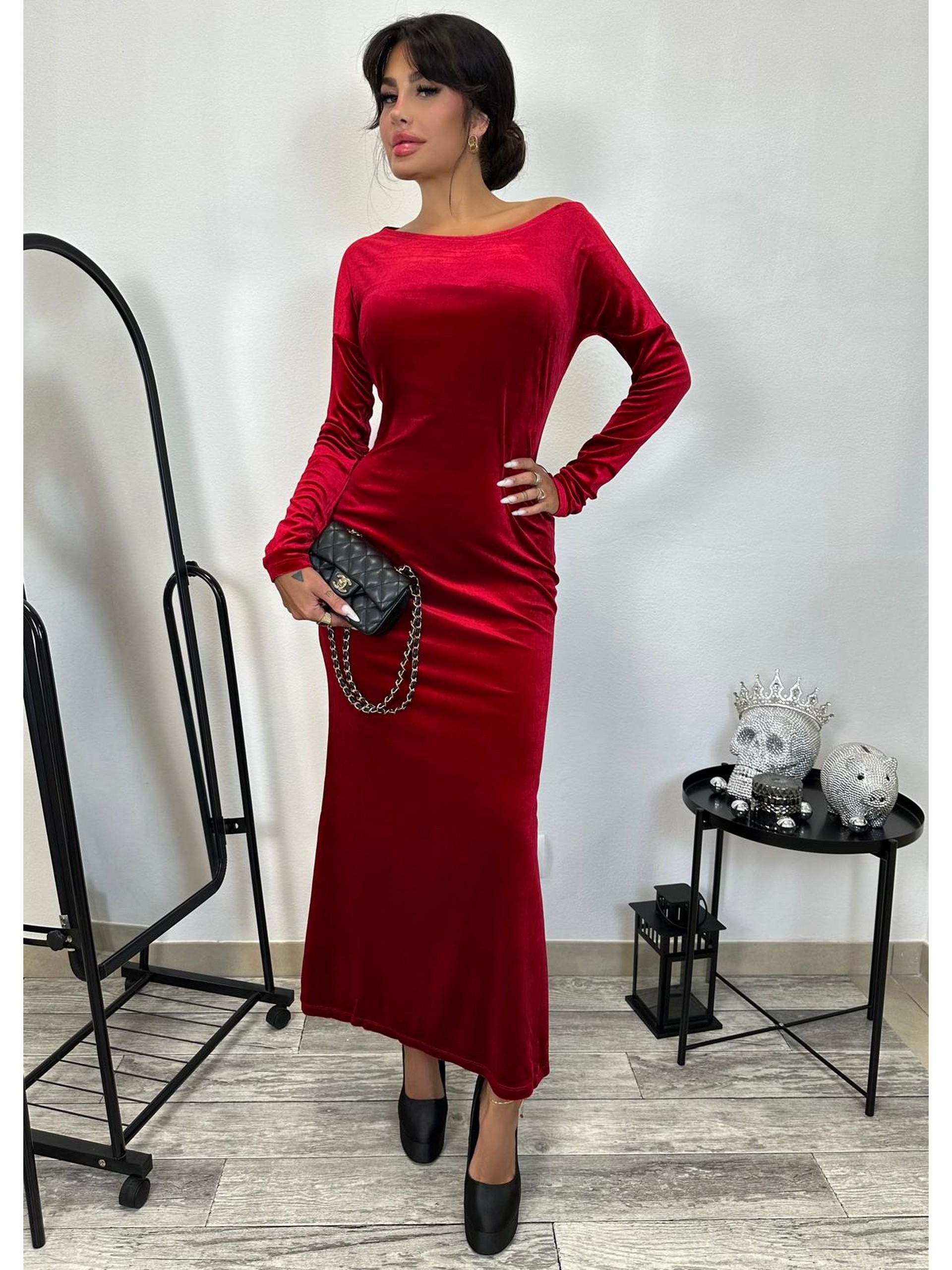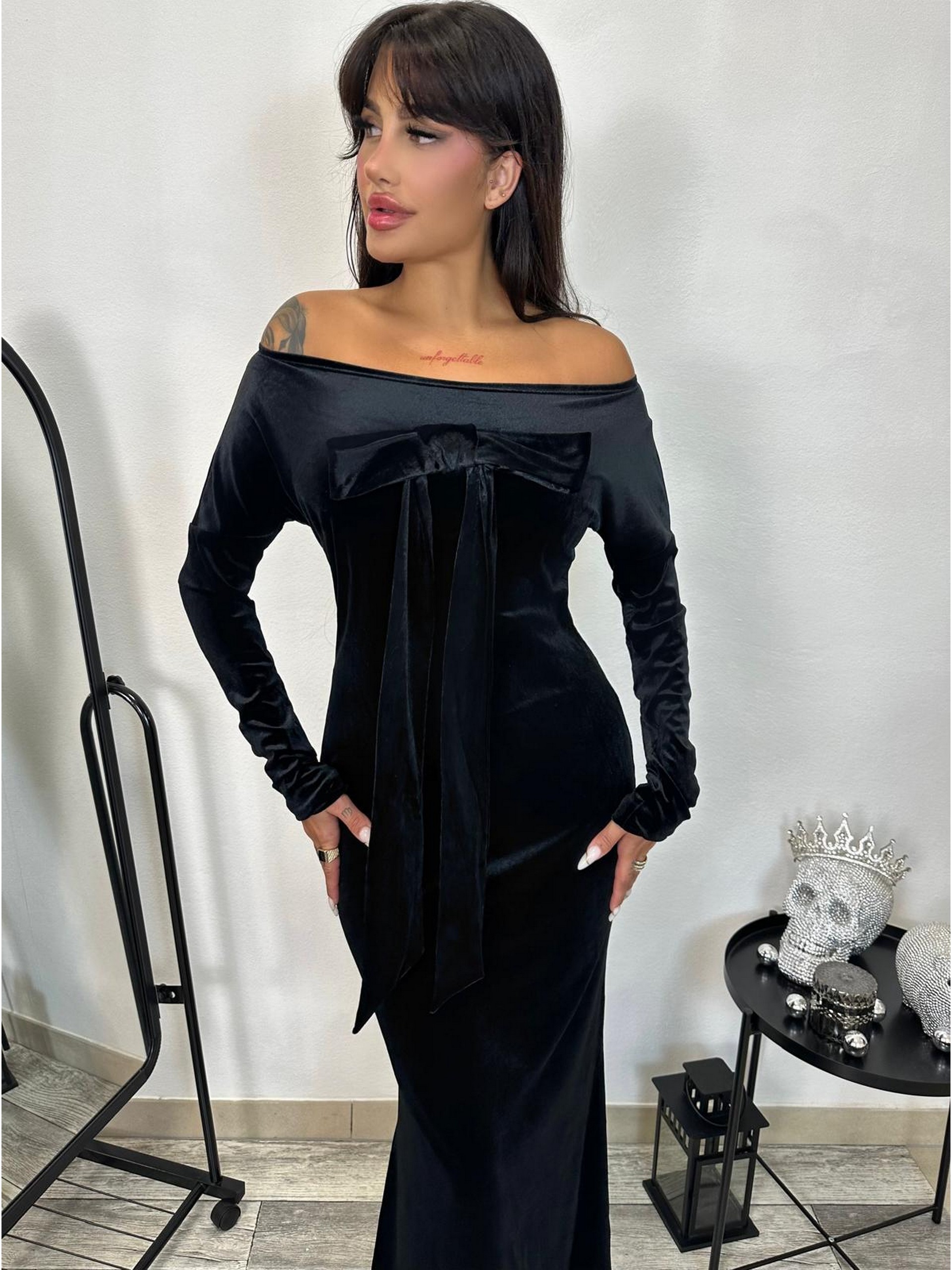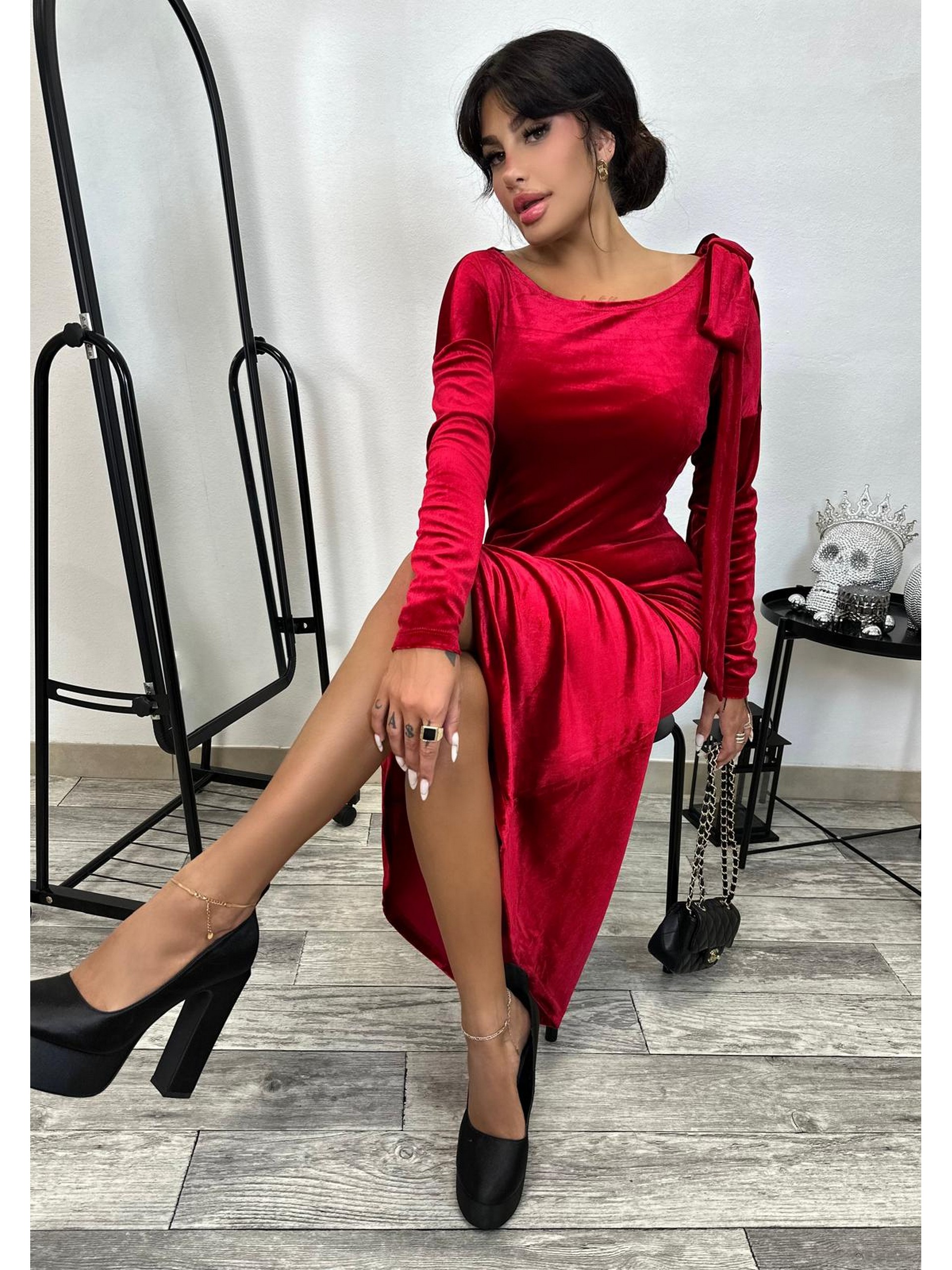 Długa sukienka z welury z dopinaną kokardą, którą możemy przypiąć w dowolnie wybranym przez nas miejscu. Prosty fason, dekolt w łódkę, długi rękaw.